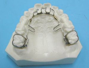 指しゃぶり防止手袋(ドクターサム)や指しゃぶり防止マニキュア(マバラバイターストップ)を使用しても指しゃぶりが治らない場合にどうするか? そのような場合は、下の写真のような悪臭癖除去装置(矯正装置の一種)を使用します。上の前歯の裏側にワイヤーの突起物が数本あり、指しゃぶりをしようと思ってもできない設計になっています。固定式なので子供が自分で取り外すことはできません。食事が少しやりにくくなりますが、短期間の辛抱です。尚、この装置は、指しゃぶりがひどいために上下の前歯が咬み合わないような開咬状態の子供(5歳~)に使用します。