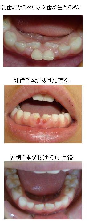 乳歯の後ろから永久歯が生えてきた場合、乳歯をすぐに抜歯する必要はありません。下の写真の症例は、患者さん本人(5歳11ヶ月、男の子)の希望によりグラグラの乳歯を抜歯せずにそのまま経過観察しました。自然に乳歯が抜けた後、前歯でよく咬んで食事をするように指導しました。1ヶ月くらいするときれいな歯並びになりました。