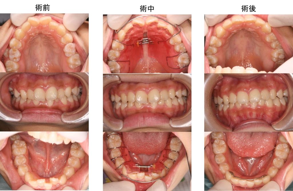 他院で矯正相談をしたところ、床矯正は無理で、乳歯が全部抜けてから本格矯正(ワイヤー&ブラケット矯正)になりますと治療方針の説明を受けたが、本人(中学1年生、女子)が取り外し式の床矯正を希望しているので何とかしてほしいとのことで来院されました。一番気になっている部分は、上の前歯が出っ歯に見える点で、次に気になるのは、下の前歯がガタガタであることでした。上下顎ともに歯の大きさに比べて顎が小さいので、床矯正装置で顎を広げていきました。上顎は床矯正装置のみで治療できましたが、下顎は、床矯正装置で顎を十分に拡大した後、下の前歯6本に4ヶ月間だけブラケットを装着し歯並びをきれいにしました。