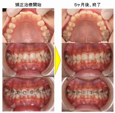 上顎の6前歯にメタルブラケットを付けて、5ヶ月で矯正治療を終了しリテーナーで保定しました。