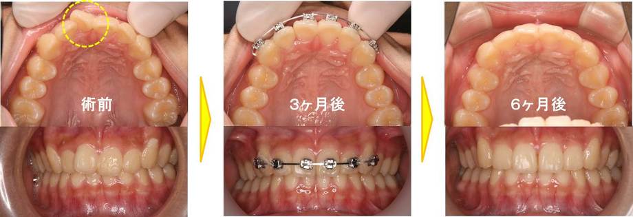 約3ヶ月後には患者さん自身がたいへん満足された状態になっています。そして約6ヶ月後にはキレイな歯並びになりメタルブラケットをはずして、取り外し式のリテーナーで歯並びを安定させています。