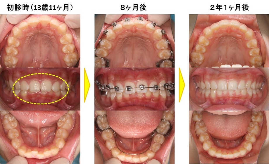 まず最初に3D矯正装置を用いて歯の裏側から歯並びを整えていき、倒れている奥歯を起こしていきながら前歯の乱れを治していきました。9ヶ月後には咬み合わせが浅くなったので、ブラケット&ワイヤー矯正を開始しました。それから1年2ヶ月後には歯並びがきれいになったので矯正装置を除去して、取り外し式の保定装置(リテーナー)を使ってもらい自宅でセルフケアしています。永久歯を抜かずにここまで歯並びがキレイになりました。下あごが正常な位置に出てきたため楽に鼻呼吸ができるようになり、姿勢も良くなりました。歯並び・咬み合わせをよくすることは、全身の健康につながります。