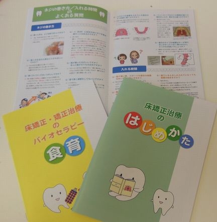 小児予防矯正(第一期矯正治療)では、床矯正装置(しょうきょうせいそうち)や3D矯正装置、T4Kトレーナーなど色々な装置を使用します。小学校低学年では床矯正装置を主に使用しています。床矯正装置を使い始めるときには、色々な資料をお渡しするのですが、その中で一番わかりやすいのが【床矯正治療のはじめ方】です。たくさんのイラストがあり説明も大変わかりやすく編集されています。床矯正治療におけるトラブルと解決法なども書かれてあり、保護者の皆さんに大変好評を得ています。
