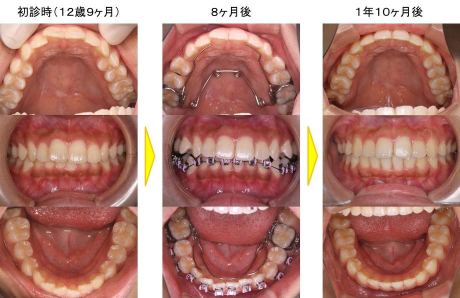 12歳中学1年生女子の症例です。出っ歯と前歯のガタガタが気になるのでキレイにして欲しいという主訴でした。出っ歯なので口びるを閉じようとしても前歯2本がでてきてしまい口びると前歯が乾燥してすぐに着色してしまうことも悩んでおられました。スペース不足のために歯並びが乱れています。下あごが少し後退していて前歯の咬み合わせが深くなっています。下あごが少し後退していることも口びるが閉じにくい原因の一つです。