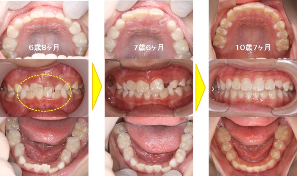 6歳8ヶ月の小学校2年生の男子の受け口症例です。母親が小学生のときに受け口の矯正治療をしていたそうです。前歯部分が完全に反対咬合(受け口)になっています。下あごの前歯はスペース不足でガタガタ(叢生)しています。床矯正装置を使用して約10か月で反対咬合は改善されました。その後もいくつかの装置を使い歯の生え変わりを利用しながら矯正治療を継続しました。乳歯が全て抜けてキレイな永久歯列になりました。