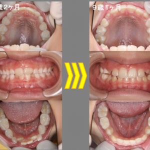 続きを読む5歳8ヶ月、受け口(反対咬合)を主訴に来院。3人兄弟で一人だけが受け口。型取りがうまくできる年齢なので、すぐに矯正治療を開始しました。床矯正装置を使い上顎前歯部の前方移動を行いました。前歯部の反対咬合が改善してからは ...